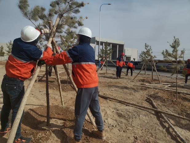 活動中,廠區(qū)內(nèi)部到處都是緊張有序的勞動景象,參加植樹的干部職工個個配合默契、干勁十足,有的拿鐵鍬,有的運樹苗,你追我趕,比干勁、比進度,各個環(huán)節(jié)銜接有序。活動現(xiàn)場共栽植棗樹、杏樹、松樹等600余棵。