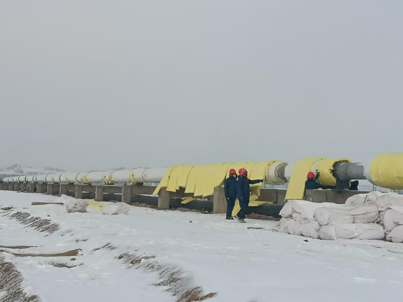 入冬以來的第二場(chǎng)雪,使得項(xiàng)目建設(shè)的難度達(dá)到新的高度。面對(duì)晝夜零下十幾度的嚴(yán)峻天氣考驗(yàn),現(xiàn)場(chǎng)施工隊(duì)伍決定在管道基礎(chǔ)制作期間,采用混凝土分段澆筑的方式有序施工。白天氣溫相對(duì)高的時(shí)候進(jìn)行澆筑,每段澆筑完成后及時(shí)搭設(shè)保溫棚,夜間在保溫棚內(nèi)部生火,避免混凝土受凍,確保其強(qiáng)度達(dá)到要求。
